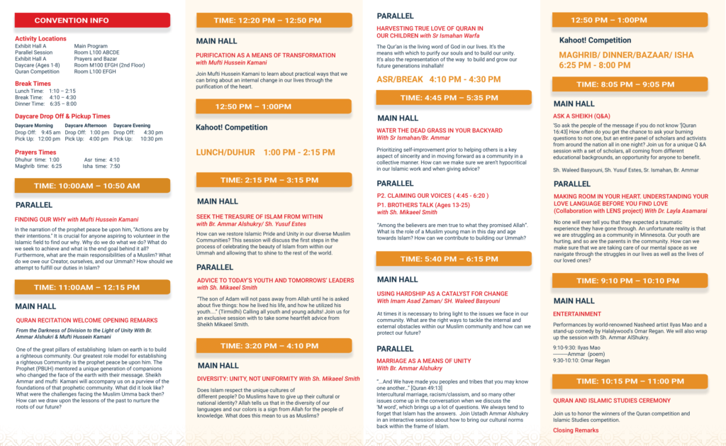 We have an amazing lineup of nationally renowned speakers, engaging programs, Quran Competition, Islamic Knowledge Competition, vibrant and diverse bazaar, unique family-friendly entertainment and more! As always, our goal is to ensure that the convention is both memorable and beneficial for you and your loved ones.