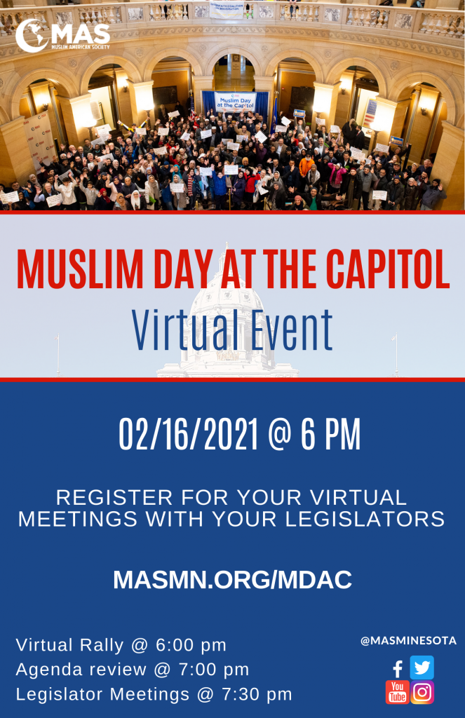 Join hundreds of Minnesotans at the upcoming Muslim Day At The Capitol 2021 as we come together to discuss challenges facing our communities and steps we can take with our legislature.
