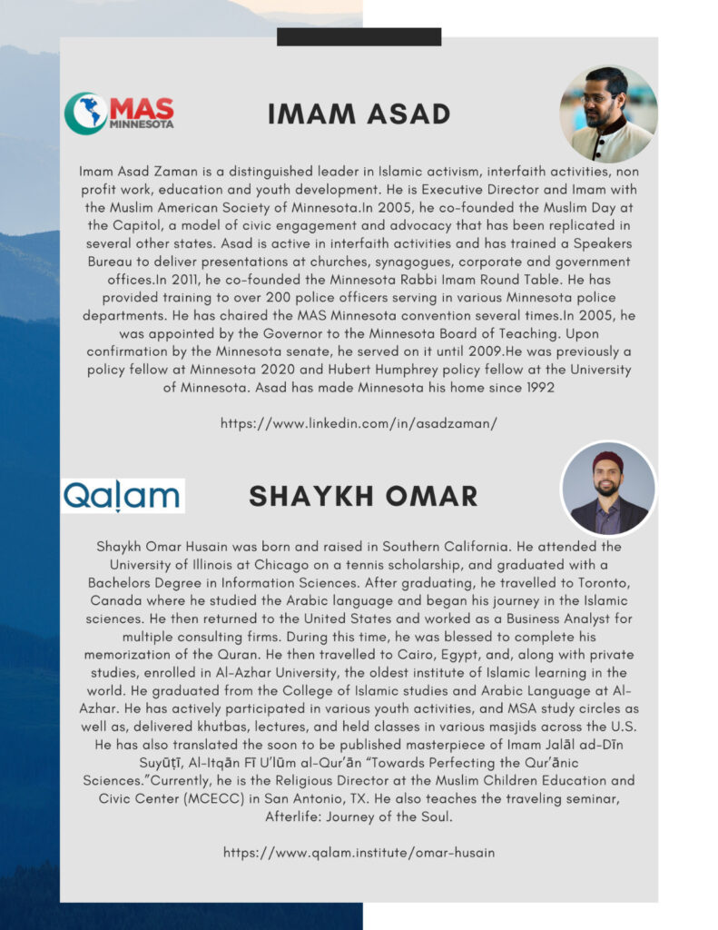 Imam Asad Zaman is a distinguished leader in Islamic activism, interfaith activities, nonprofit work, education and youth development. He is Executive Director and Imam with the Muslim American Society of Minnesota.In 2005, he co-founded the Muslim Day at the Capitol, a model of civic engagement and advocacy that has been replicated in several other states. Asad is active in interfaith activities and has trained a Speakers Bureau to deliver presentations at churches, synagogues, corporate and government offices.In 2011, he co-founded the Minnesota Rabbi Imam Round Table. He has provided training to over 200 police officers serving in various Minnesota police departments. He has chaired the MAS Minnesota convention several times.In 2005, he was appointed by the Governor to the Minnesota Board of Teaching. Upon confirmation by the Minnesota senate, he served on it until 2009.He was previously a policy fellow at Minnesota 2020 and Hubert Humphrey policy fellow at the University of Minnesota. Asad has made Minnesota his home since 1992
